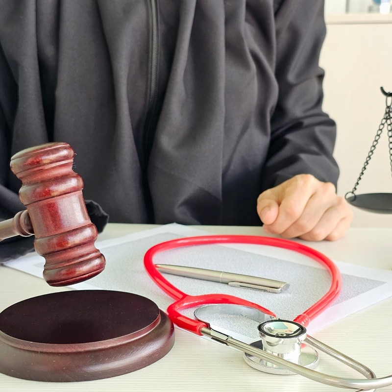 A close-up of a person behind a desk wearing a black robe, holding a wooden gavel next to an orange stethoscope.